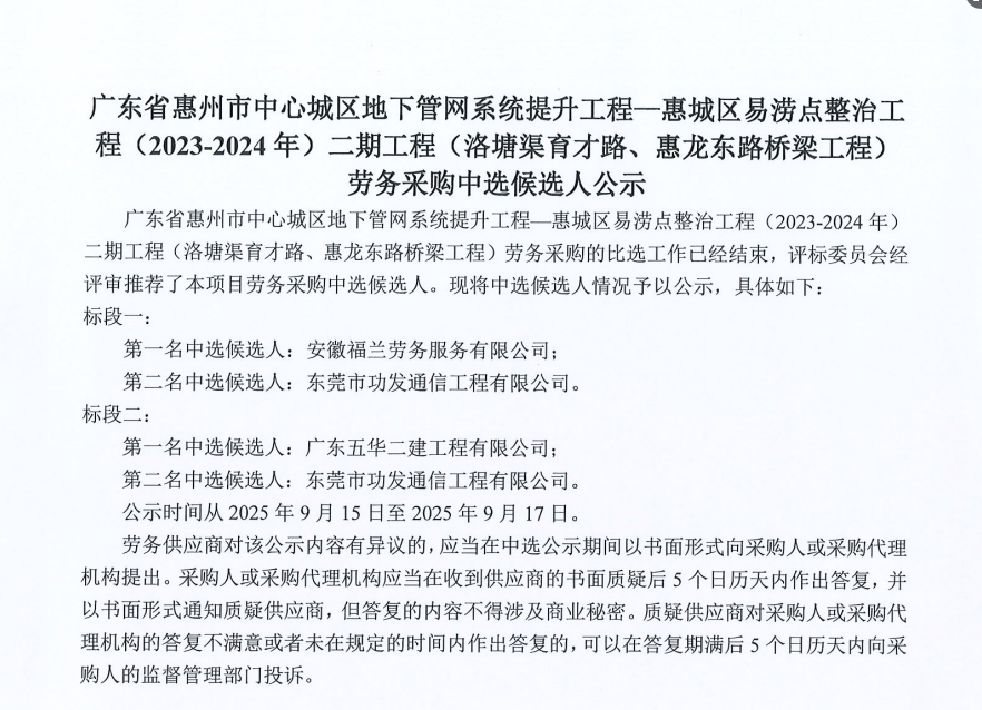 廣東省惠州市中心城區(qū)地下管網(wǎng)系統(tǒng)提升工程-內(nèi)街小巷排水管網(wǎng)病害修復(fù)及錯(cuò)混接改造項(xiàng)目一期施工勞務(wù)采購(第二次)中選候選人公示……